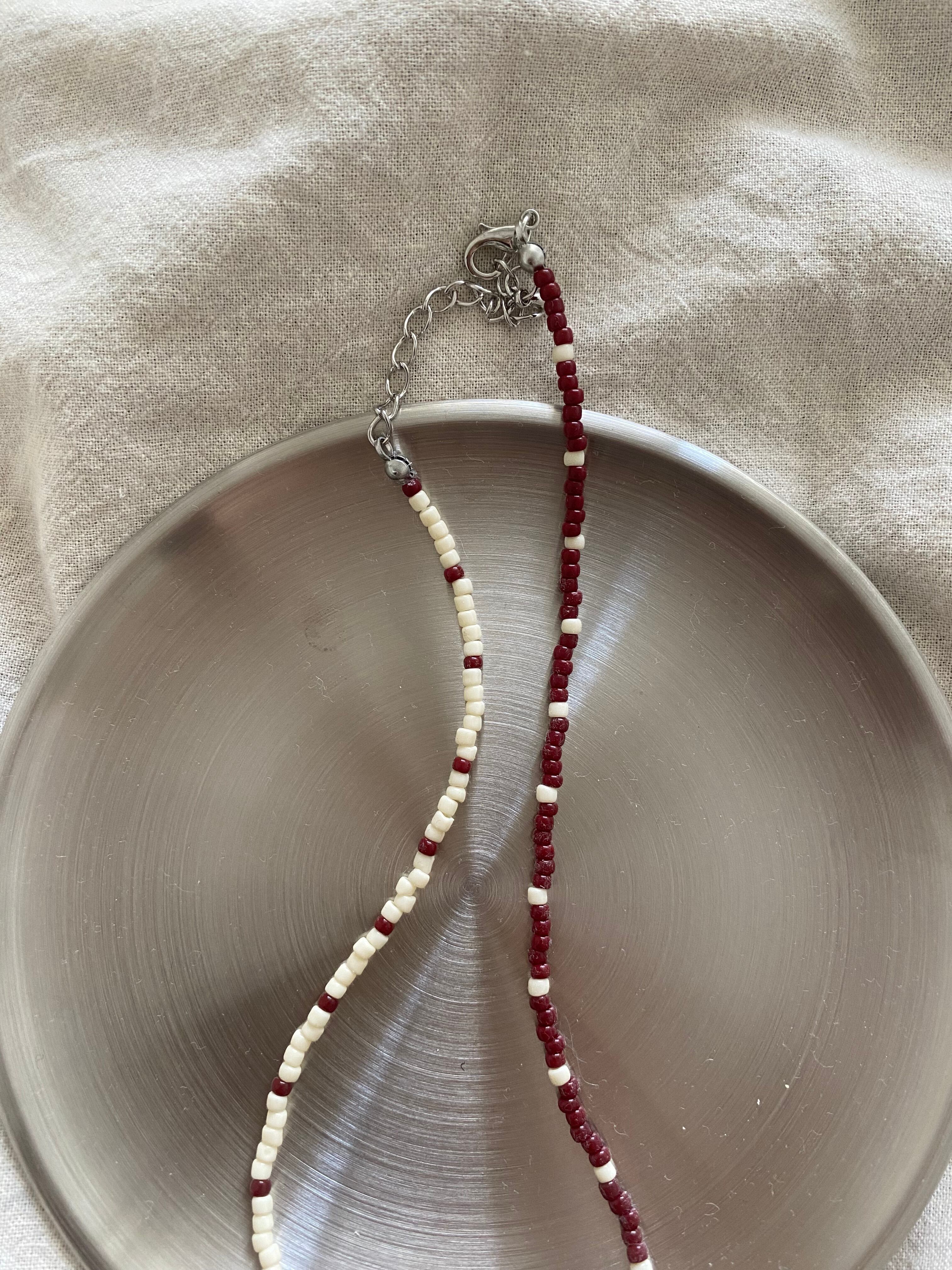 コーヒーみたいな深いブラウンとミルクのような淡いアイボリーカラーのビーズを組み合わせたネックレス。